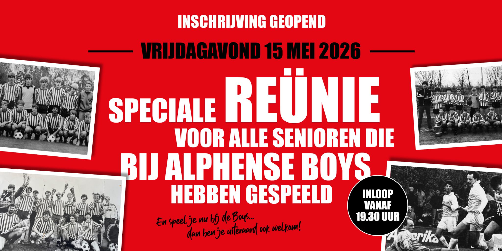Je kunt je nu aanmelden voor de reünie voor alle senioren die ooit bij Alphense Boys hebben gespeeld. Datum: vrijdag 15 mei a.s. vanaf 19.30 uur in ons clubhuis. Klik op de button hieronder.