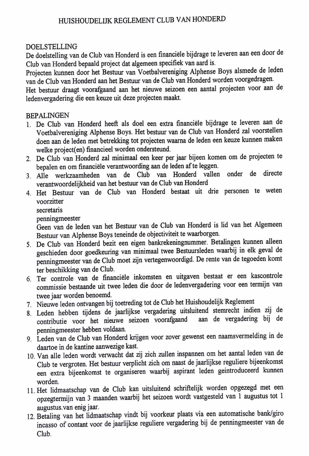 Met het lidmaatschap van de Club van Honderd geeft u Alphense Boys een steuntje in de rug. Met een bedrag van 50 euro per seizoen draagt u bij aan de verdere groei en bloei van onze vereniging, in de breedste zin van het woord. Met de opbrengsten van de Club van Honderd worden uiteenlopende wensen vervuld die binnen de vereniging leven. Kenmerk van ons werk is dat het geld steeds aan een project wordt besteed waarvan ieder lid, van jong tot oud, profiteert.