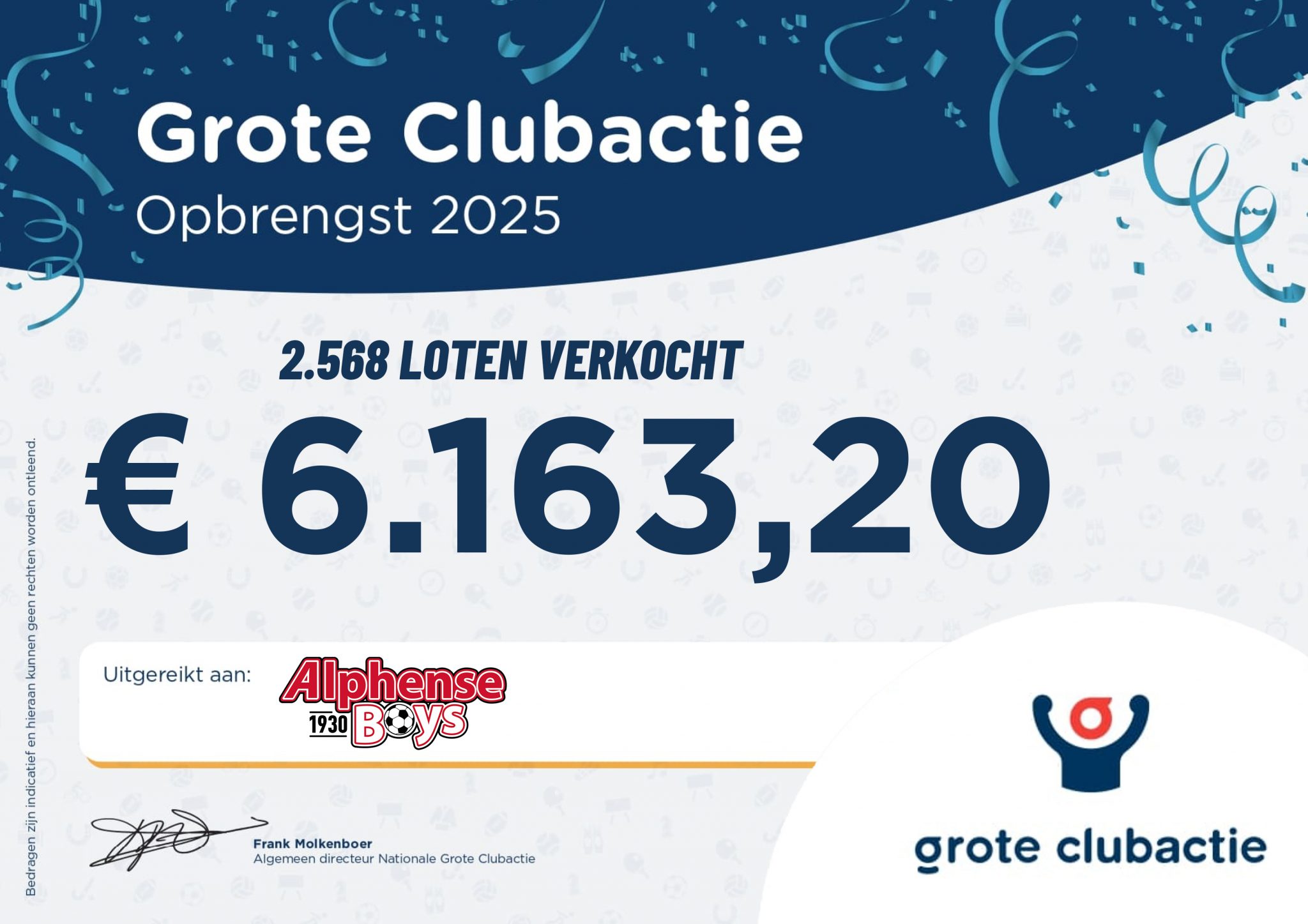 De Grote Clubactie is afgelopen en de uitslag is bekend. Onze Boys en Girls zijn flink aan de slag geweest en hebben totaal 2.568 loten verkocht, met een totaalopbrengst van EUR 6.136,20.